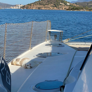 Um ihre Sicherheit und ihr Wohlbefinden auf dem Katamaran zu gewährleisten, haben wir viele Vorkehrungen getroffen. Sie trägt ein Airtag-Halsband, wenn wir in den Hafen fahren, und nachts ein MOB-Halsband (Mann-über-Bord), das Alarm schlägt, falls sie ins Wasser fallen sollte. Zudem haben wir die Reling mit einem Sicherheitsnetz ausgestattet, damit sie sicher auf dem Boot unterwegs ist. Für ihre Bedürfnisse haben wir die Tischbeine mit Schnur umwickelt, damit sie einen Platz zum Kratzen hat, und einen großen Pflanzentopf mit frischem Gras an Bord, den sie liebt.